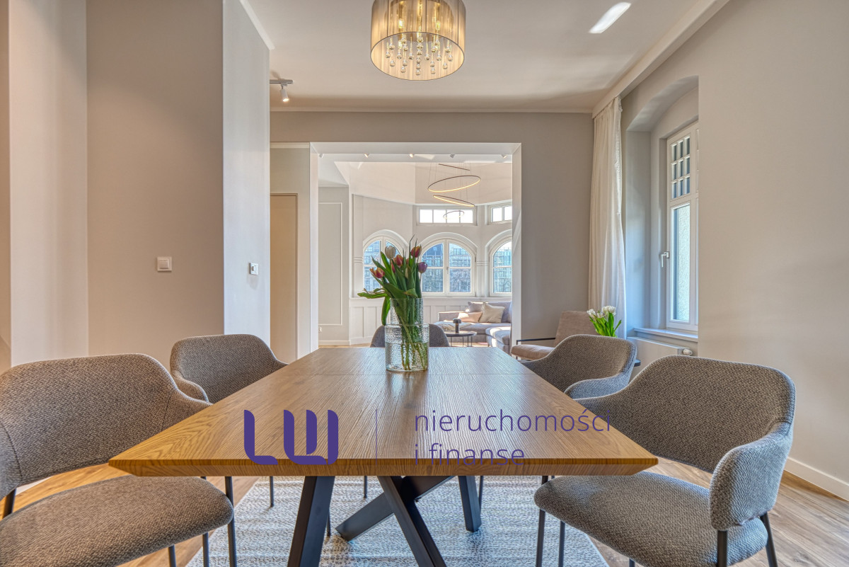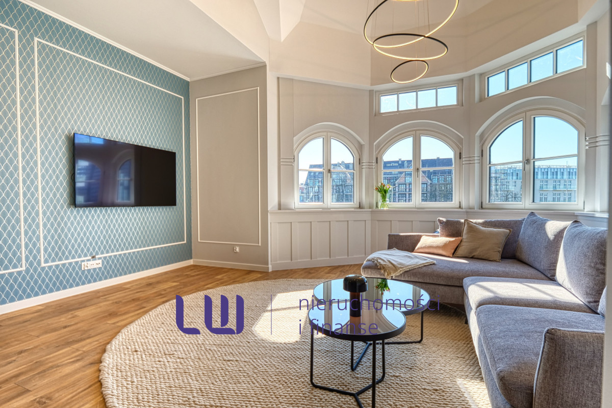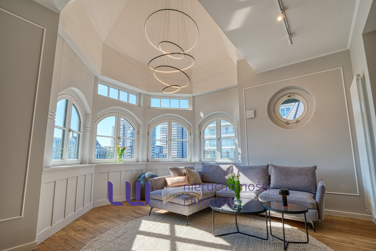 Apartament należy do dwóch najbardziej reprezentacyjnych lokali w całym budynku. Jego znakiem rozpoznawczym jest unikalna wieżyczka z imponującą wysokością sufitu sięgającą 6 metrów. Ta spektakularna przestrzeń nadaje wnętrzu wyjątkowej lekkości, podkreśla jego prestiż i tworzy niepowtarzalny klimat.