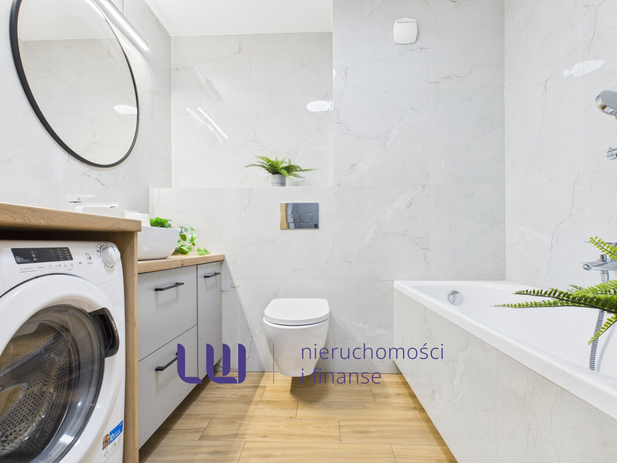 - łazienka w szafki do przechowywania, wannę z prysznicem, umywalkę, lustro, pralkę oraz toaletę,